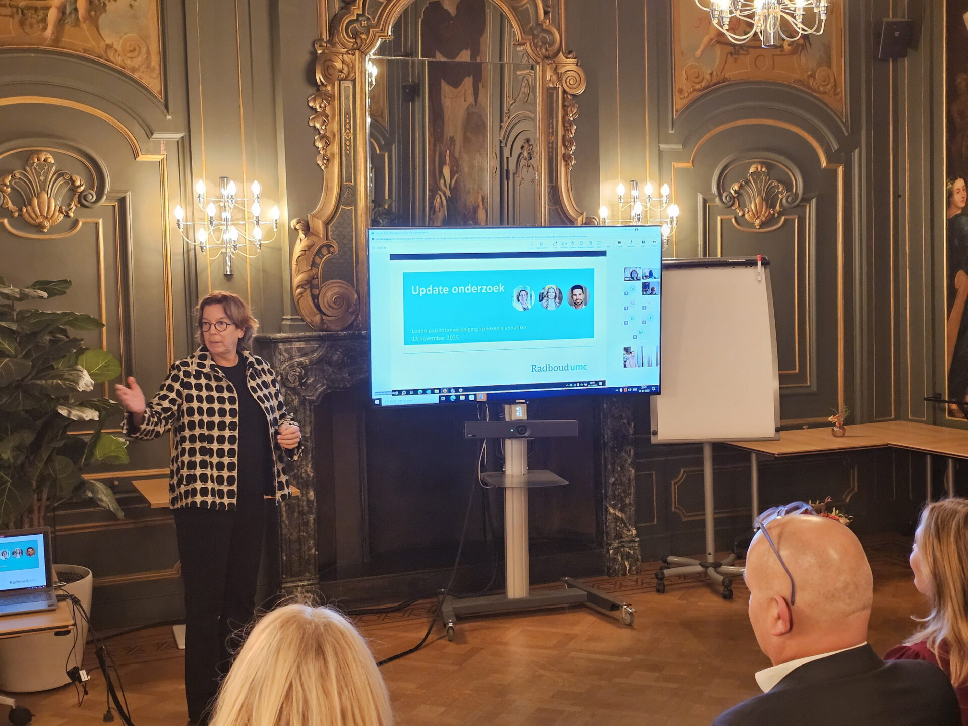 Op donderdag 13 november was er een bijeenkomst van onze vereniging in het prachtige Huize Heyendaal in Nijmegen. Zo’n 25 leden en gasten hadden de files doorstaan en waren fysiek aanwezig. Daarnaast volgden circa 25 leden en gasten de bijeenkomst digitaal. Tijdens de bijeenkomst zijn Albert van der Knaap en Hannie Ruck toegetreden tot het bestuur van de vereniging. Albert neemt de rol van voorzitter op zich en wil zich in de komende jaren graag inzetten voor de vereniging. “We zijn een kleine vereniging en dat vraagt reële doelstellingen. Die doelstellingen doen ertoe! Ondersteuning van de leden, het organiseren van lotgenotencontact, meer bekendheid van speekselklierkanker, fondsenwerving voor onderzoek en het verbeteren van diagnosestelling en behandeling. Samen met het bestuur, de leden en Carla van Herpen en haar mensen ga ik daarvoor mijn uiterste best doen”. Nadat Alex Tenders ook de kascontrole over 2024 had toegelicht en de jaarrekening van de vereniging was goedgekeurd, volgde het inhoudelijke deel van de bijeenkomst. Kimberly Burghout gaf samen met haar collega Jurre Weijer een presentatie over het onderzoek van de afdeling pathologie van het Leids Universitair Medisch Centrum naar de mogelijkheden om de diagnostiek van speekselkliertumoren te verbeteren met behulp van een databank van tumorweefsel en de toepassing van AI (zie hier haar presentatie). Daarna namen Carla van Herpen, Niels van Ruitenbeek en Jetty Wijers ons mee in de stand van zaken van de verschillende onderzoeken die momenteel worden uitgevoerd naar betere behandelmogelijkheden van verschillende vormen van speekselklierkanker (zie hier de presentatie). Tijdens de bijeenkomst was er voor de aanwezige leden en gasten volop gelegenheid om bij te praten. Het was een geslaagde avond en hopelijk zien we elkaar weer bij de lotgenotendag die in het voorjaar van 2026 zal worden georganiseerd!  Een korte foto impressie: foto-1, foto-2, foto-3.